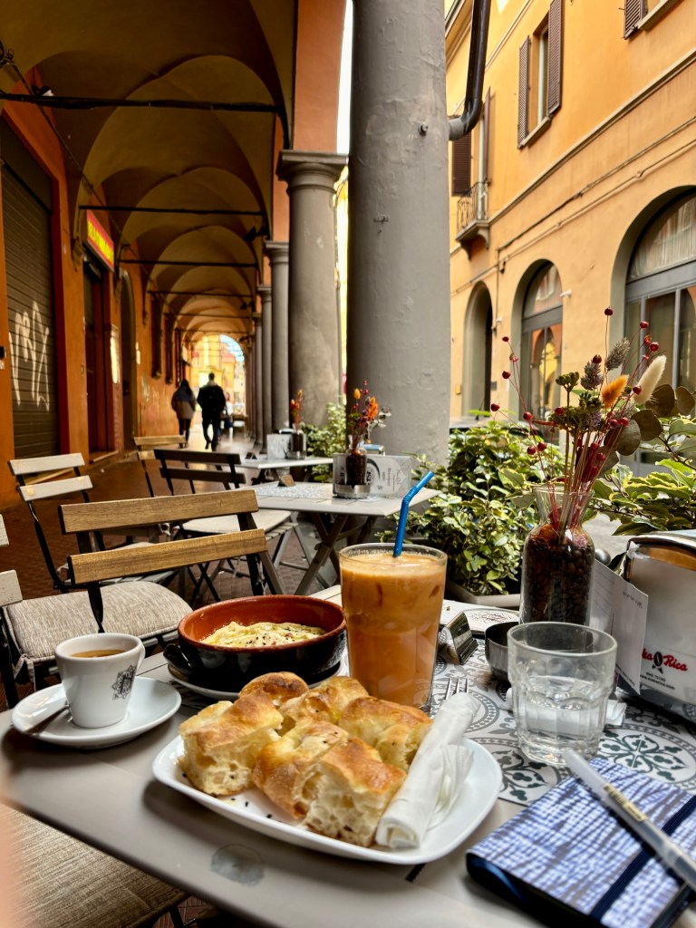 On my final day in Bologna, I found myself enjoying Turkish breakfast at Naama Cafe, a cafe in a portico. Enjoying a turmeric smoothie and baklava – you can take the girl out of Turkey…