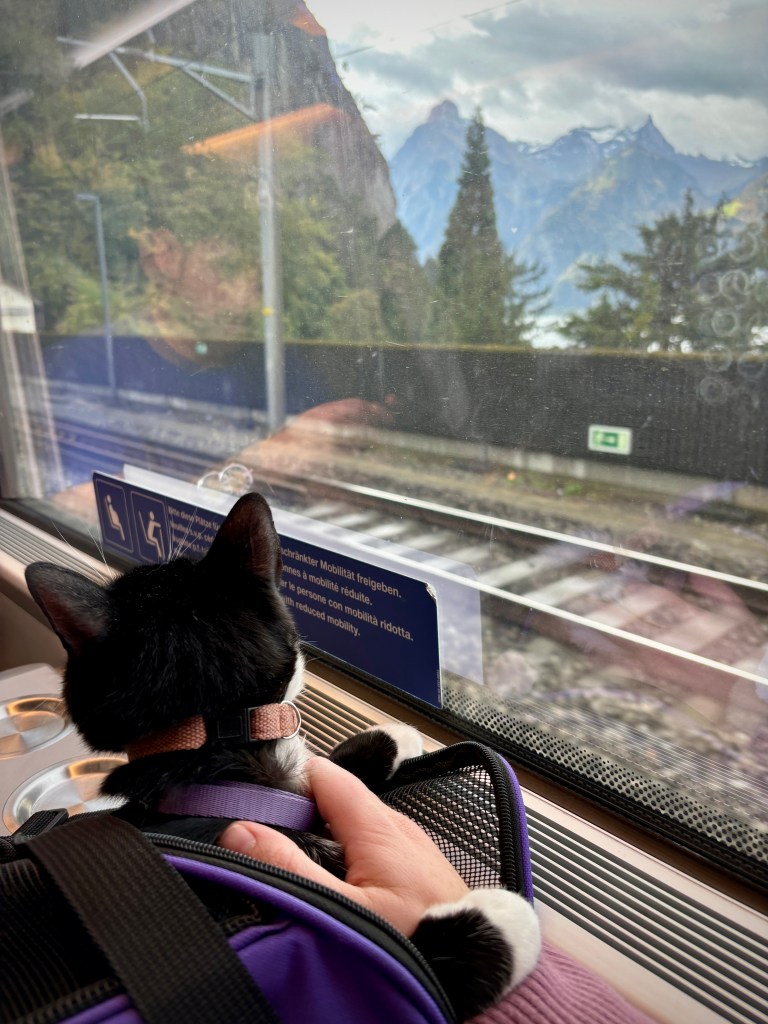 Well, folks, I have returned from my quick trip to the States. Very happy to report that I returned with the cat in tow. She rocked her first train trip from Zurich down to Lugano. I let her out of the bag, so to speak, around the Gotthard Pass and introduced her to her fourth country.