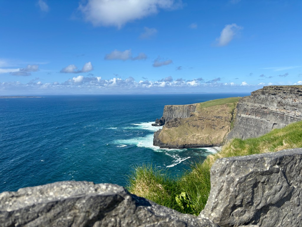 From Killarney, we took Conor’s advice and hopped the car ferry, the Shannon Breeze, from Country Kerry to Country Clare. En route to the Cliffs of Moher, we enjoyed yet another blue bird day – quite incredible our luck with the weather throughout the trip, really. Upon arriving at the Cliffs, I ran into a colleague from Moscow, Anne O’Toole. Anne guides at the site and lives in the Doolin area now. It was fantastic to catch up with her, completely out of the blue.