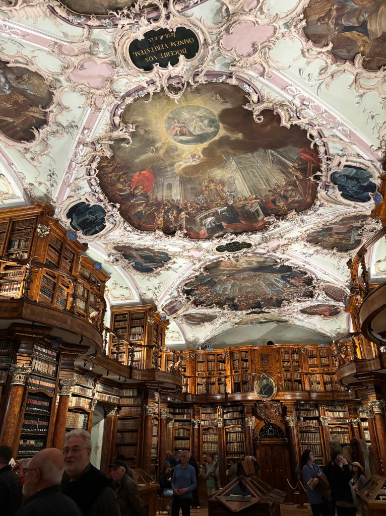 Following my swim, I made my way to the Stiftsbibliothek, a UNESCO World Heritage site. Dating back to the Carolingian Era (8th century), the library is the oldest in Switzerland and absolutely stunning in its physical beauty. As you enter, a guide provides each guest with an oversized pair of slipper clogs, adding to the Swiss-German appeal and transforming you into an elfen-like creature, shuffling about the place. Polished wood and fresco cover every surface of the ornate two-story space. More reminiscent of Baroque or Rococo to me, overflowing bookshelves line every wall in this book lover’s paradise.