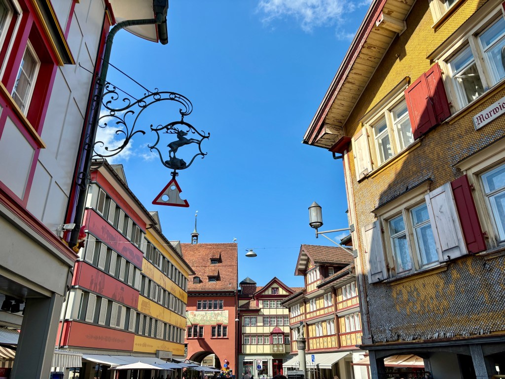 After lunch, I made my way back to the train station, as I had a ticket to Appenzell, a town nestled among the rolling hills outside St. Gallen. Known for its delicious cheese and chocolate, Appenzell is extremely unassuming upon arrival at the one-track train station. A short five-minute walk into town reveals a bustling (at least on a Saturday), lively downtown, full of restaurants spilling out into the town’s square.